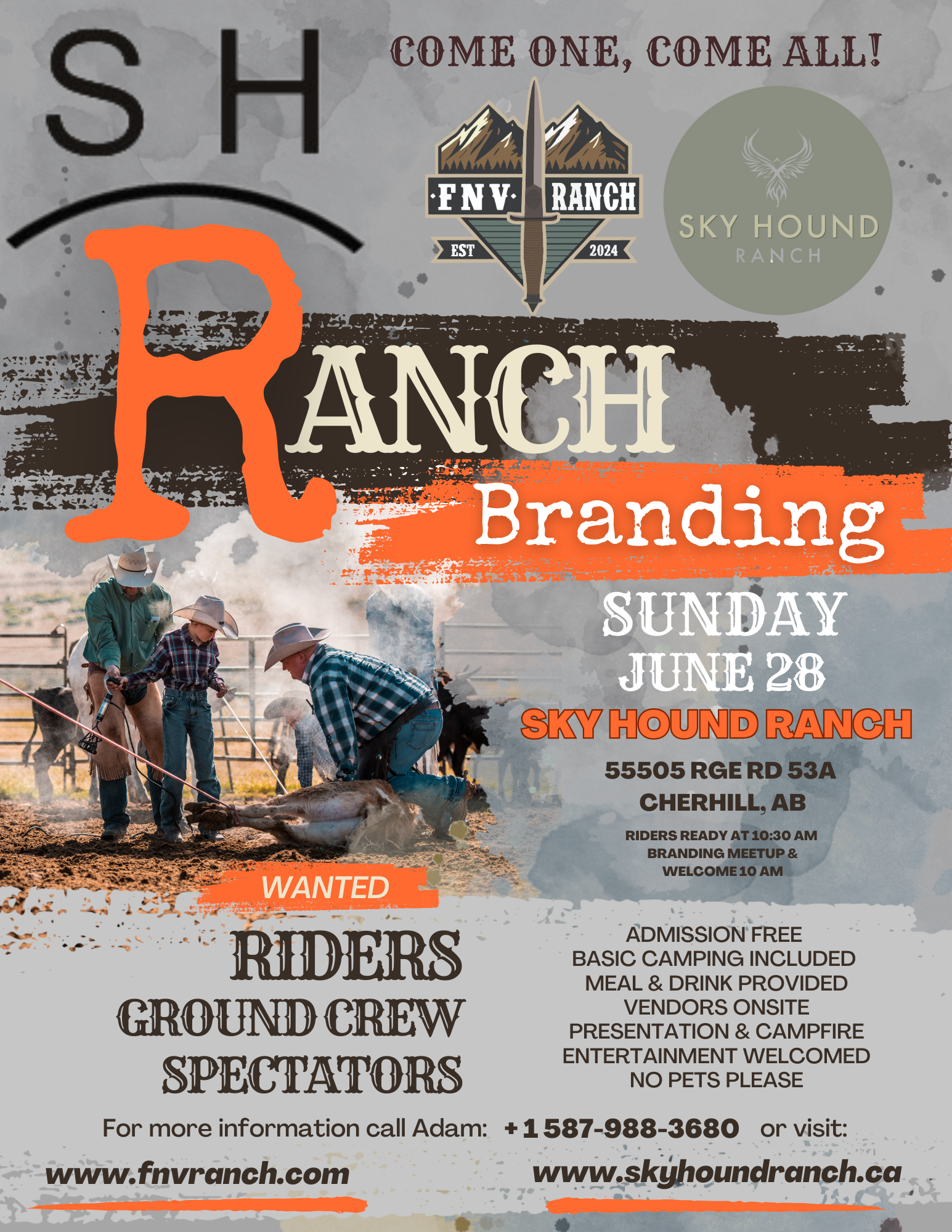 Whether you’re riding, wrangling, working gates, or just there to connect. We’ve teamed up with veteran-owned FNV Ranch to host a hands-on day of western ranch culture where veterans, first responders, service members, and families can learn, connect, and experience the old-fashioned way of branding. No cattle experience necessary, we’ll teach you. Riders please arrive at 9:00 to help with the roundup and cattle sorting before branding begins around 10:30. Stick around for snacks, chilli and buns, free rustic camping, and if the weather’s good, a campfire night with stories and songs.